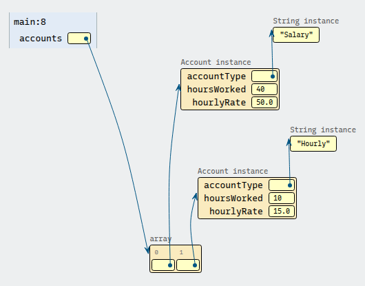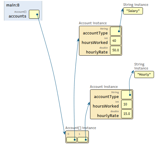 Account[] accounts = new Account[2]; accounts[0] = new Account("Salary", 40, 50.0); accounts[1] = new Account("Hourly", 10, 15.0);