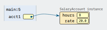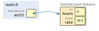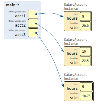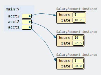 3SalaryAccount acct1 = new SalaryAccount(8, 20.0); 4SalaryAccount acct2 = new SalaryAccount(10, 22.5); 5SalaryAccount acct3 = new SalaryAccount(6, 18.75);