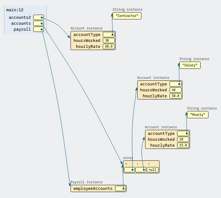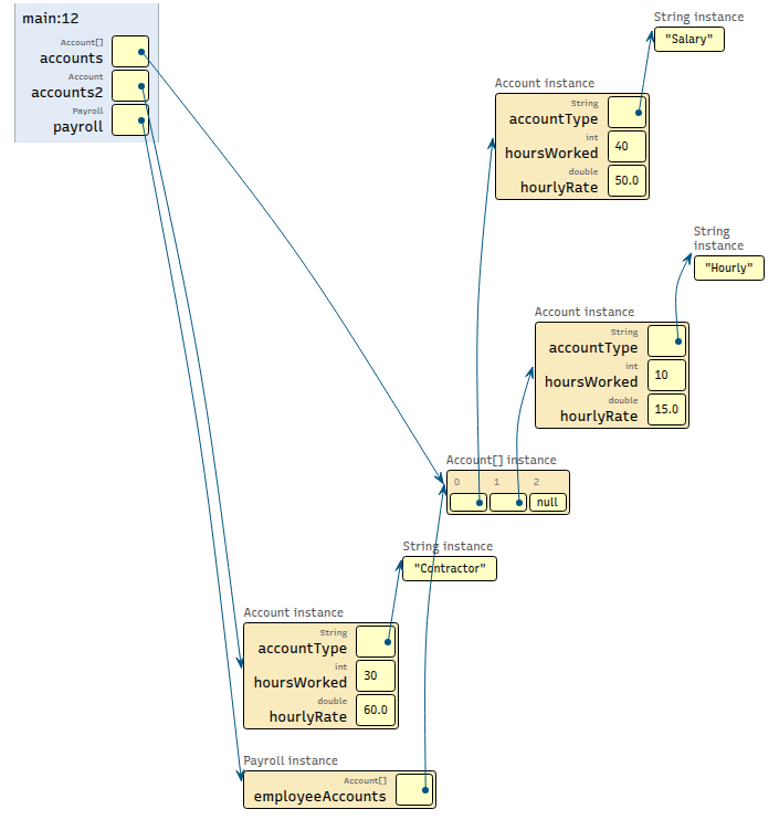 Account[] accounts = new Account[3]; accounts[0] = new Account("Salary", 40, 50.0); accounts[1] = new Account("Hourly", 10, 15.0); Account accounts2 = new Account("Contractor", 30, 60.0); Payroll payroll = new Payroll(accounts);